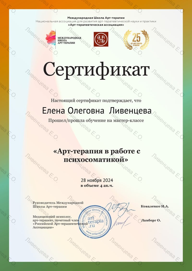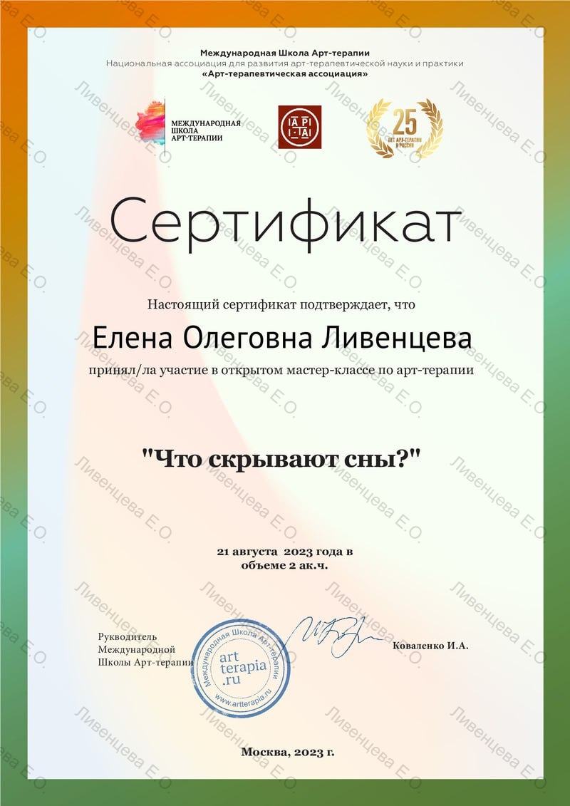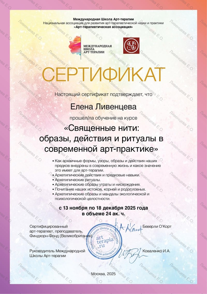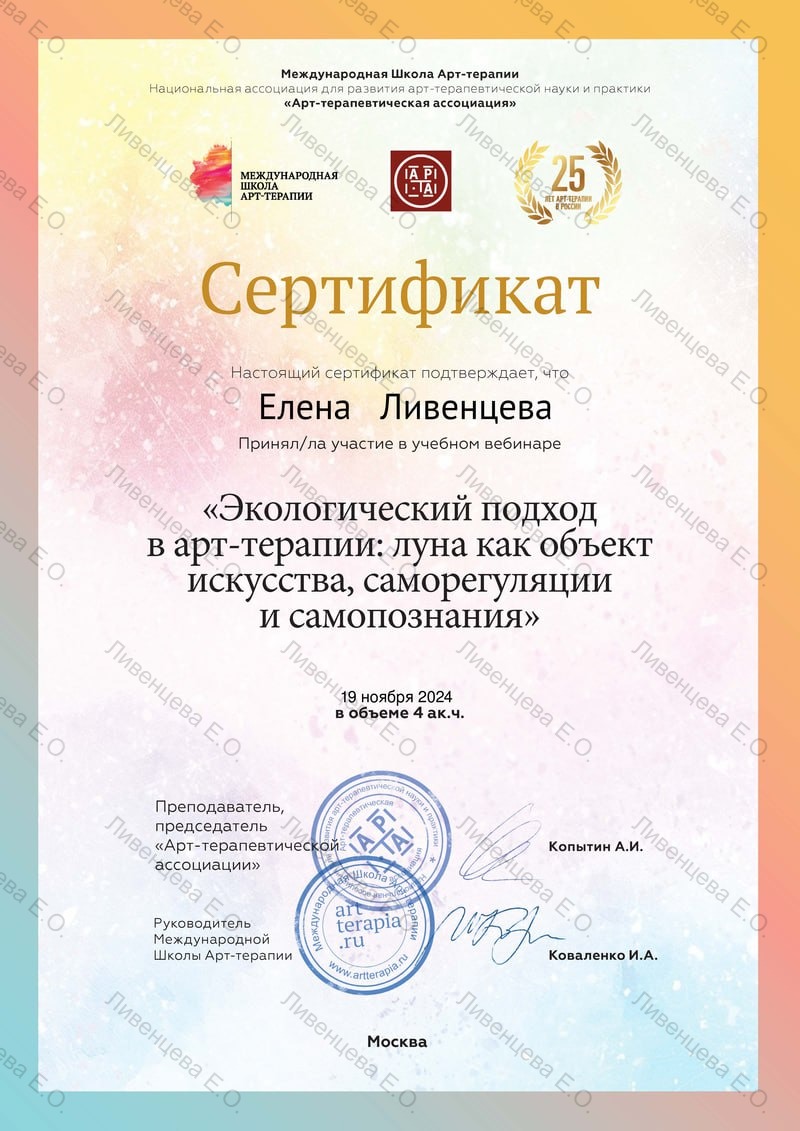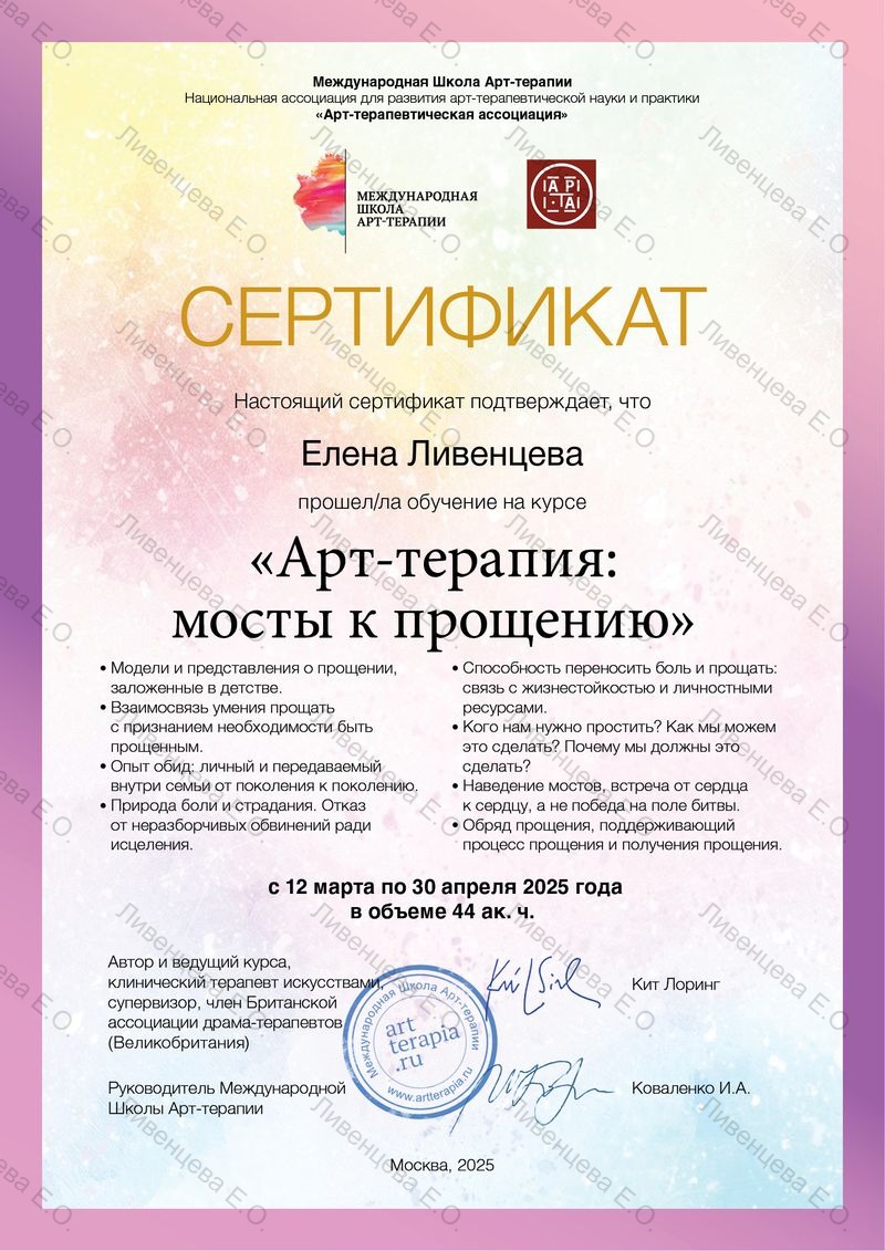 «Елена - мягкий, глубокий человек. Проходила с ней восстановление после творческого кризиса. На столько деликатно и тонко работает, что шансов на сопротивление и слив вообще нет) Я снова вернулась в фотографию, поверила в себя. Каждый раз на Арт-терапии она раскрывает новые грани запроса и играючи распаковываются глубоко запрятанные страхи, тревоги, напряжение. буквально вчера перед встречей мое тело буквально сигналило, что что-то не в порядке, бровь дергалась как бешенная. После практики все успокоилось. Однозначно рекомендую Елену, особенно тем, кто нуждается е остановке, передышке и спокойствии. Благодарю за твой дар».